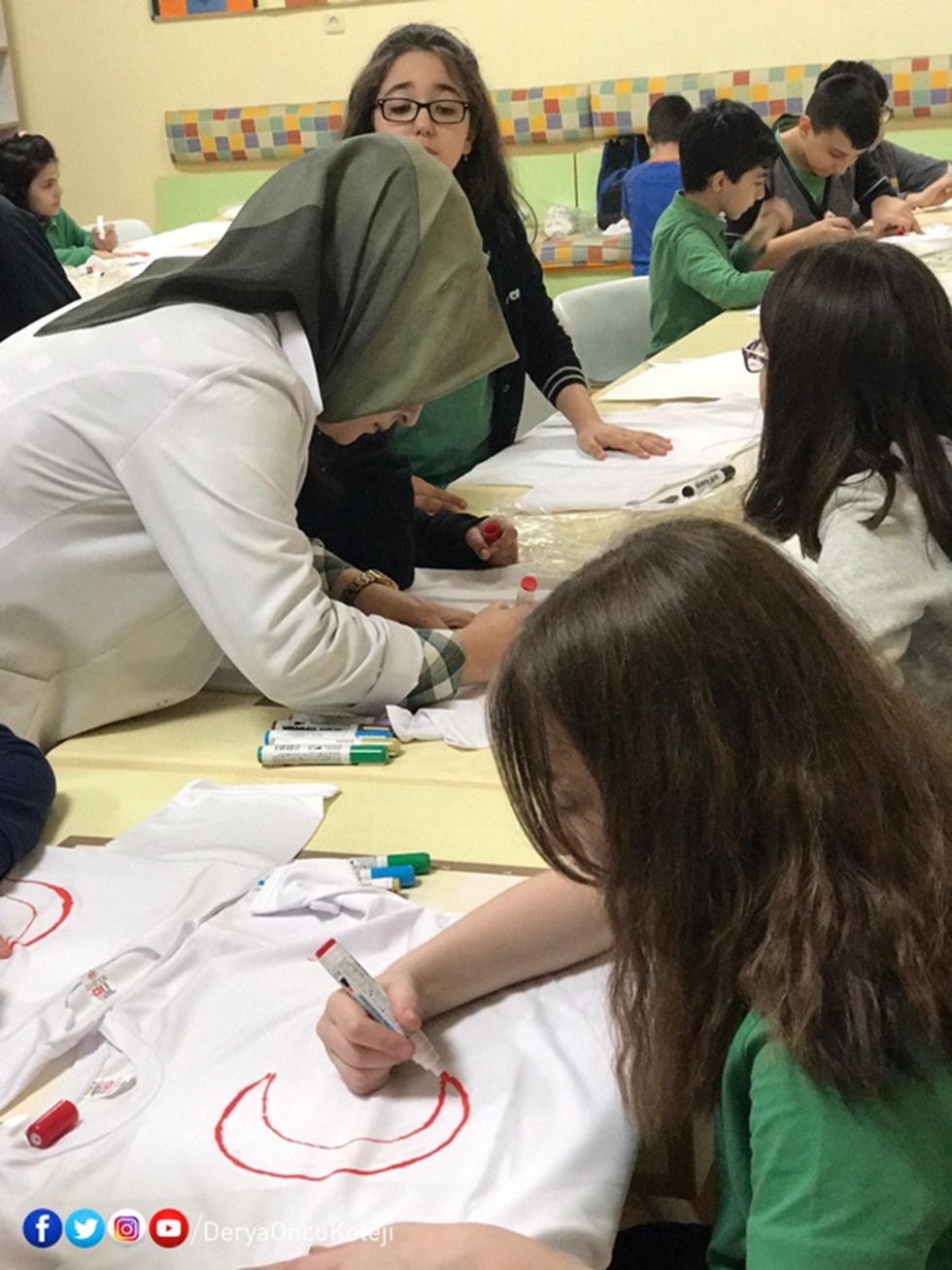 Okulumuzda 5. Sınıf öğrencileri tarafından Çanakkale şehitlerini anma temalı tişört boyama etkinliği yapıldı. Etkinlik öncesi öğrencilere "Çanakkale" konulu sunum izletildi. Türk evladı olarak bu vatanın kolay kazanılmadığını atalarımıza çok şeyler borçlu olduğumuzu ve bu vatana sahip çıkmamız gerektiğini bir kez daha anımsadık. Sunumun ardından öğrencilere dağıtılan tişörtler Çanakkale konseptiyle ilgili olarak hazırlanan kalıpların yardımıyla rengarenk boyandı. Öğrencilerimiz kendi tasarladıkları tişörtleri Çanakkale şehitlerini andığımız törende giydiler.