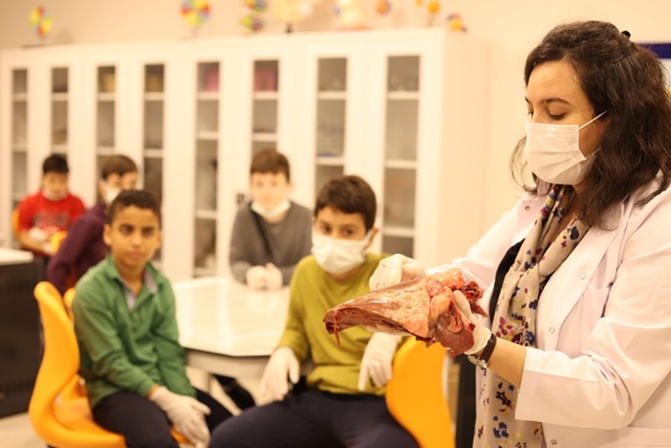6/A sınıfı olarak, Fen Bilimleri dersimizde dolaşım sistemi unsurlarından biri olan kalbin yapısını ve kısımlarını gözlemleyebilmek amacıyla dana kalbi diseksiyonu gerçekleştirdik. Kalbin odacıklarını, kalp kapakçıklarını, atardamar ve toplardamarlar ile kalbi besleyen koroner damarları inceleyerek kalbin çalışma prensibini daha iyi kavrama imkanı bulduk. Aynı zamanda mikroskopta kalp kası ve insan kanı preparatlarını inceleyerek bu yapıların özelliklerini kavradık ve izlediğimiz eğitici videolar sayesinde dolaşım sistemi fizyolojisi adına çeşitli bilgiler öğrendik.