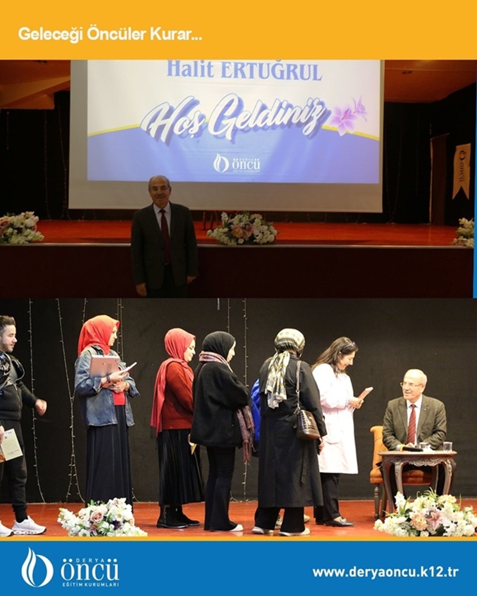 Yazar-öğrenci buluşmaları kapsamında yazar Halit Ertuğrul, Derya Öncü Anadolu Lisesi öğrenci ve öğretmenleriyle buluştu. Başarıda Moral ve Motivasyon konulu bir söyleşi gerçekleştirdi. Hayatta başarılı olmanın gereklerini anlatan Halit Ertuğrul, başarılı olmanın anne, baba ve sevdiklerine vefa borcunu ödemek için gerekli olduğunu, ayrıca toplumda ezik durumda kalmamak için, onurlu yaşamak için gerekli olduğunu söyledi. Çocukların eğitiminin en önemli bir parçasının da kitap okumak olduğunu belirten Ertuğrul, "Bugüne kadar 60'tan fazla kitap yazdım, yüzlerce konferansa katıldım. 28 kitabım farklı dillerde yayınlandı. Bir öğrenciyi bile okuma sevdasına kaptırabilirsek bizim en büyük mutluluğumuz olacaktır" dedi. Kendi hayatından kesitler veren Halit Ertuğrul sözlerine şöyle devam etti; "Ben yokluklar içinde anasız babasız büyüdüm. Bu nedenle okul harçlığımı simit satarak ve ayakkabı boyacılığı yaparak kazandım. Şimdi ise üniversitede profesörlük yapıyorum, dedi. Başarıya giden yolları örnekler ile açıklayan yazar öğrencilerden gelen soruları da cevapladı. Söyleşi sonunda kitaplarını da imzalayan Ertuğrul, söyleşiye ilgi gösterdikleri ve anlatılanları dikkatli dinledikleri için öğrencilerimize teşekkür etti.