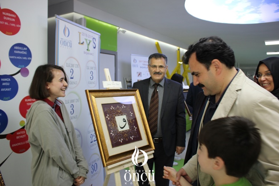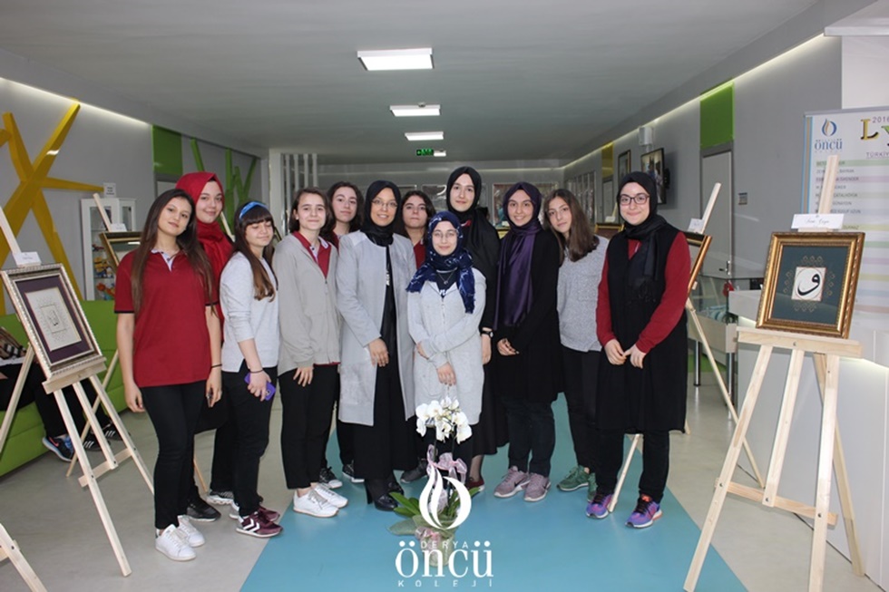 Lisemizde beşinci senesini Büşra Bayrak hocamızın koordinatörlüğünde tamamlayan tezhip çalışmasının aylar boyu sabırla işlenen ürünleri güzel bir sergiyle gün ışığına çıktı. On beş öğrencimizin, tezhip hocamız Elif Üner rehberliğinde işledikleri on sekiz tezhip eserinden oluşan sergimizin açılışını yapan tezhip sanatçısı Urfa Milli Eğitim Müdürü Şerafettin Turan öğrencilerimizi tebrik ederek sanat çalışmalarının eğitimdeki önemine dikkat çekti. Genel Müdürümüz Haydar Temel ve Okul Müdürümüz Fatih Özdemir'in de iştirak ettiği açılış töreninde tezhip hocamız Elif Üner'in aktardığı "Mesleğiniz ne olursa olsun, meşrebiniz sanat olsun" ifadesi ise kulaklarımızda hoş bir seda olarak yerini almış oldu.