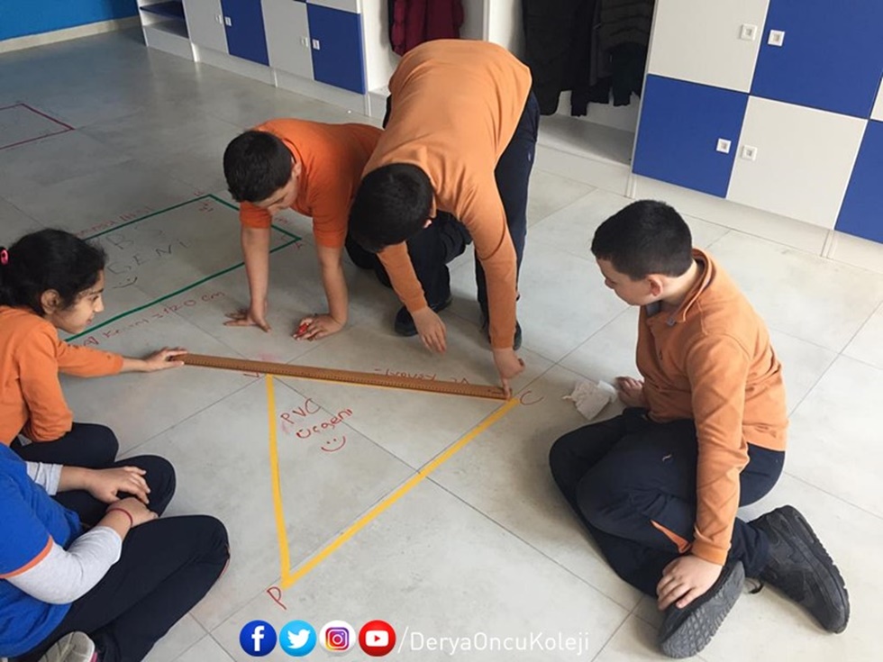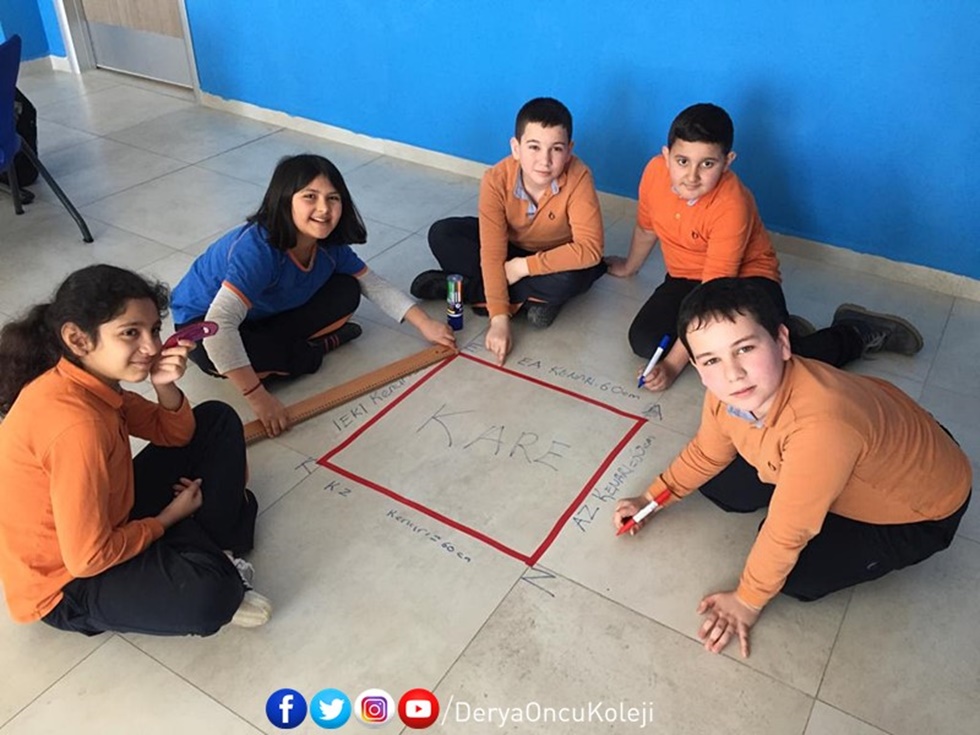 Matematik dersinde geometrik şekillerin çizimlerine eğlence kattık. Elimize aldığımız cetvel ve kalemlerle sınıfımıza büyük geometrik şekilleri, uzunluklarını ölçerek çizdik daha sonra hepsine bir isim vererek özelliklerini öğrendik.