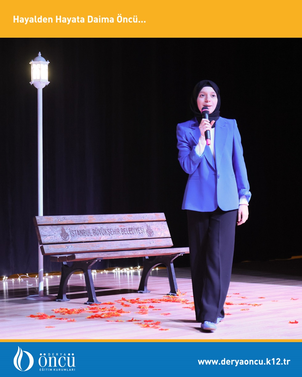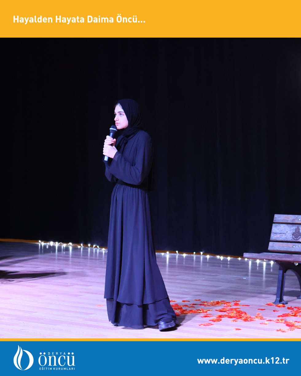Çekmeköy Özel Derya Öncü Anadolu Lisesi öğrencileri, eğitim modelimizin bir parçası olan "Şahsiyet Yetkinliğinin" alt kategorisi "İçe dönük düşünme" doğrultusunda yeteneklerini gösterdi. Disiplinler arası bakış ile sunulan "Hayat ve Ölüm" temalı şiir dinletisi birinci dönemin kapanış programı olarak dinleyicileriyle buluştu.