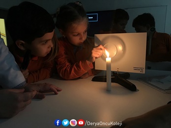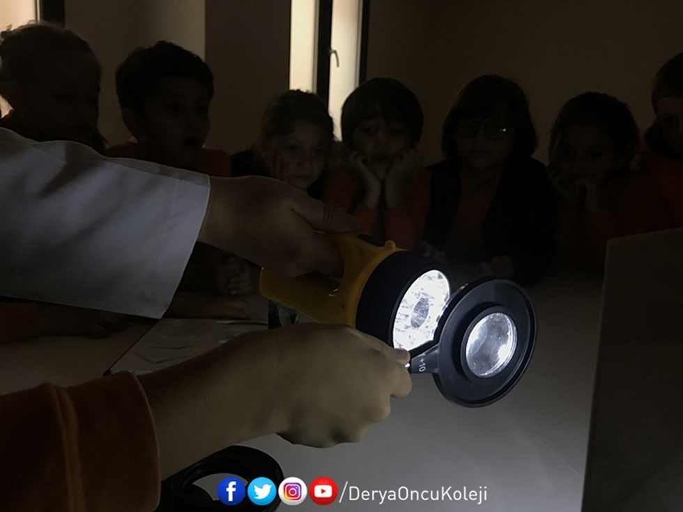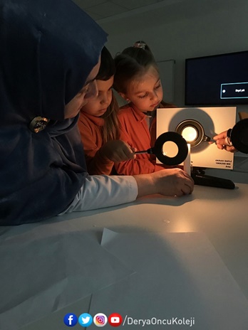 Çekmeköy Kampüsümüzde bu hafta eğlenceli bilim dersimizde ışığı tanıdık. Işığın farklı merceklerle yansıması sonucu oluşan görüntüleri ekranımızda inceleyerek ince kenarlı mercekte ışığın toplandığını kalın kenarlı mercekte dağıldığını gözlemledik. Ardından prizmadan geçen ışığın beyaz kâğıt üzerinde oluşturduğu gökkuşağı renklerini izledik. Renk çarkımızı çevirerek beyaz rengi elde ettik. Eğlenerek öğrendik.