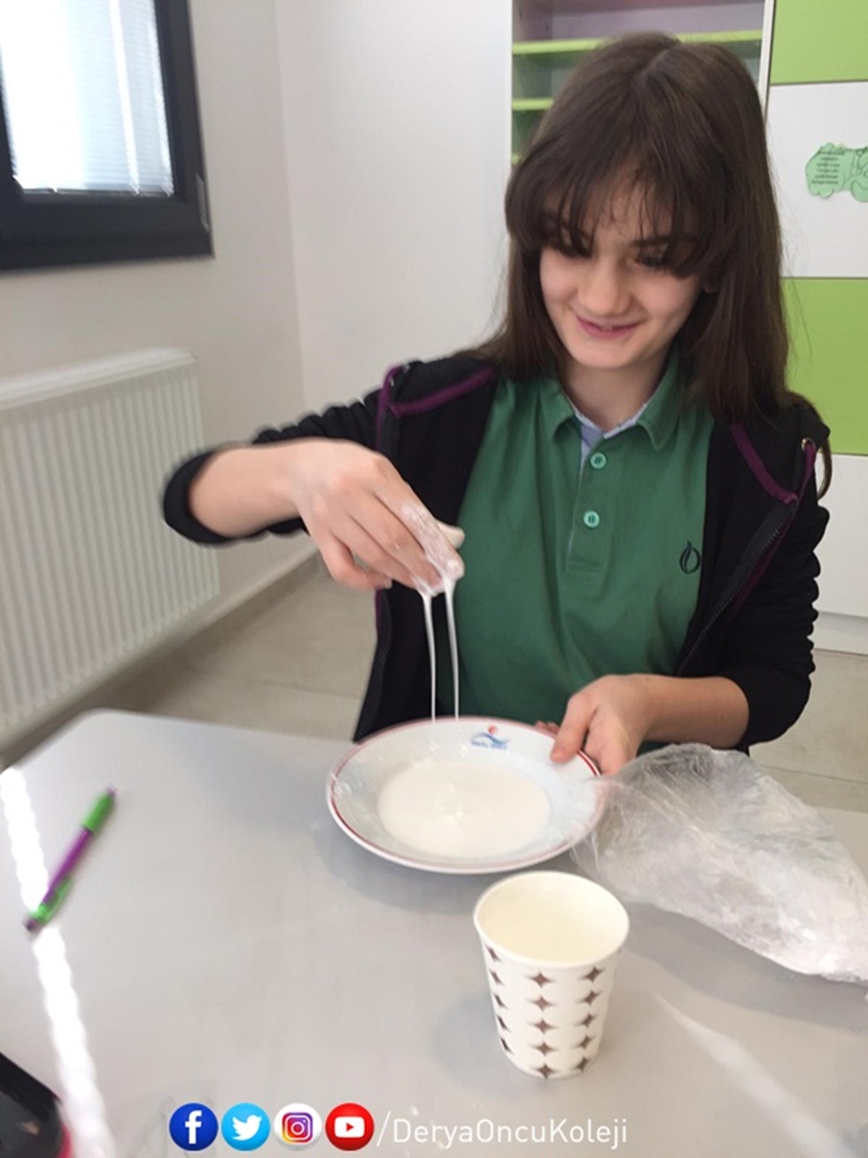 6. sınıf öğrencilerimizle oran konusunu ''oobleck'' yaparak işledik. Bir bardak nişastaya yarım bardak su ekleyerek hazırlanan oobleck için ½ oranı olduğunu fark ettik. Farklı oranlarda oobleck yaparak oranlar arttıkça miktarlarında nasıl değiştiğini gördük. Daha sonra "Tüm okula yapmaya kalksak ne kadar su ne kadar nişasta gerekir?" ya da "Kişi sayısını değiştirirsek oranlarda nasıl değişme olur?" gibi sorularla konuyu kavramaya çalıştık. Hayatın herhangi bir yerinde öğrendikleri konuyu kullanmak öğrencileri de fazlasıyla motive ediyor. Ellerimizin kirlendiği ama eğlenerek öğrendiğimiz bir dersi daha geride bıraktık.