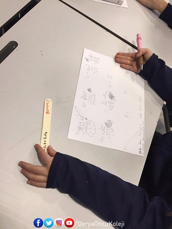 5. sınıf öğrencilerimizle ondalık sayılarda toplama konusunda dil çubuklarından da yararlanarak sorular hazırladık. Soruyu çeken ve doğru çözen öğrenci 10 puan aldı. Ama 'bomm' yazan soruyu yakalayana kadar; bu soruyu bulan öğrenci soruyu çözecekti ama puan alamadığı gibi tüm puanları da silinecekti. Bol kahkahalı ve eğlenceli bir dersle konumuzu tekrar etmiş olduk.