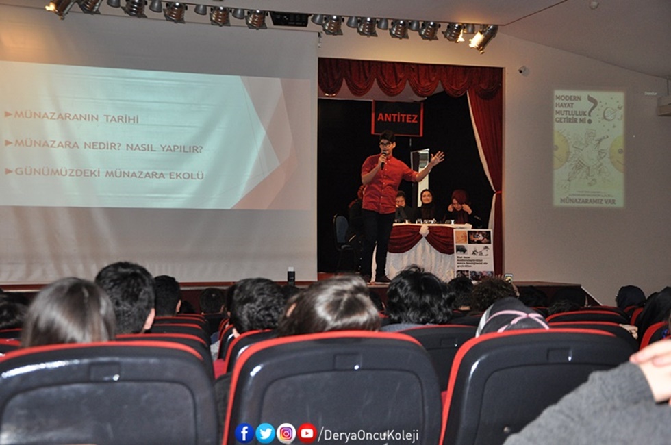 Tartışma türlerinden biri olan münazara öğrencilerin; araştırma becerileri, zihin yapıları, diksiyon özellikleri gibi çeşitli gelişim aşamalarına hitap ettiğinden liselerde çokça kullanılmaktadır. Bu düşüncelerden yola çıkan okulumuz, öğrencilerinin gelişimlerine katkıda bulunmak ve onların özgür düşünen, düşündüklerini özgürce ifade eden bireyler olmalarını sağlamak adına her yıl olduğu gibi bu yıl da münazara etkinliğini gerçekleştirmiş bulunmaktadır.