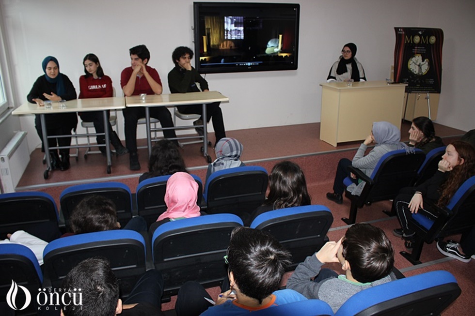 Bu yıl 8. Sınıflar için okuma listesinde yer alan Avrupa Gençlik Kitap Ödülü Şeref Listesi'ne girmiş ve kırktan fazla dile çevrilmiş olan Momo'yu Çekmeköy kampüsümüzün muhteşem sahnesinde izleyen sekizinci sınıf öğrencileri oyunda yer alan abi ve ablalarıyla bir araya gelerek oyun ve kitap hakkında çok keyifli bir sohbet gerçekleştirdiler.