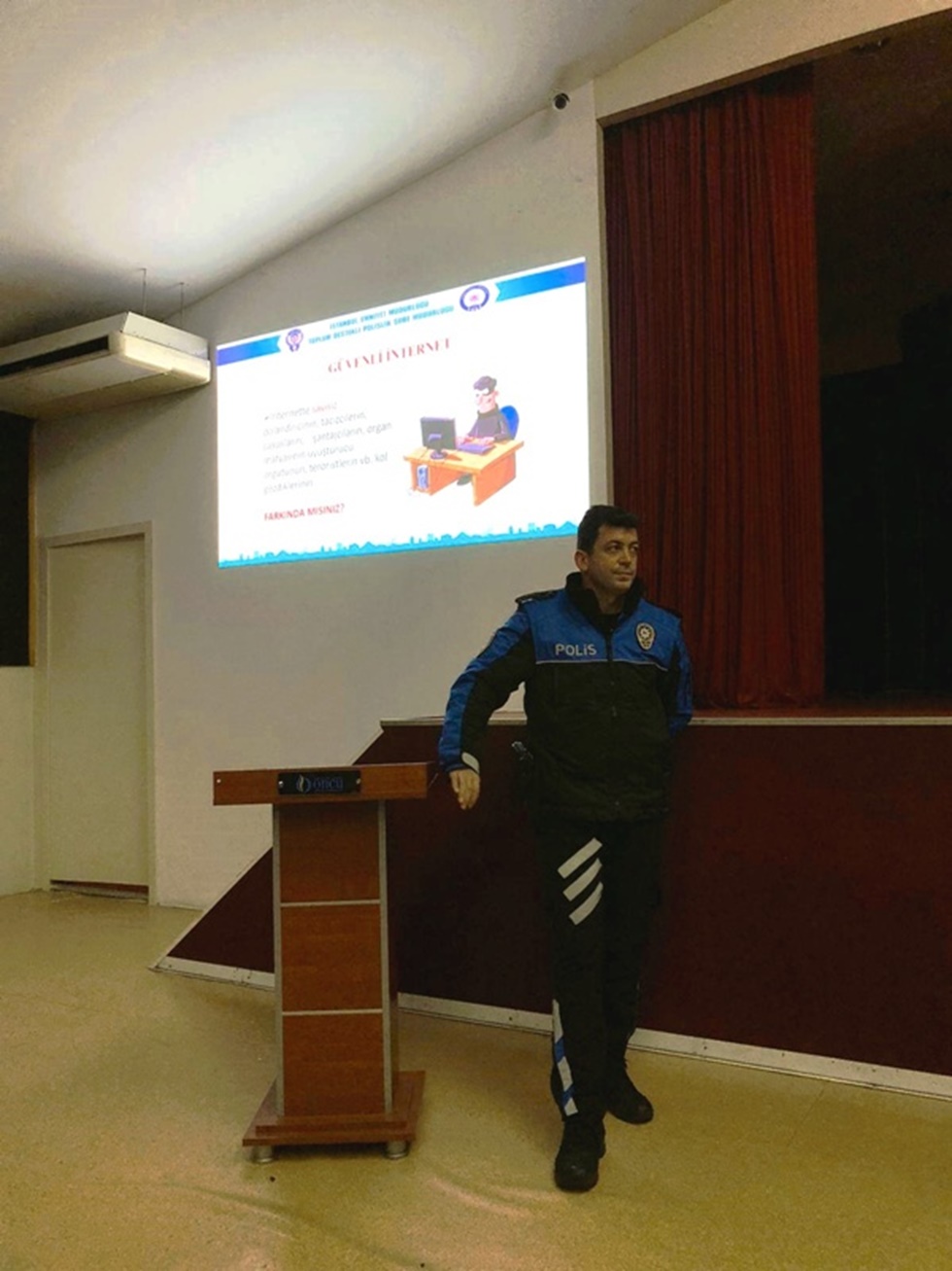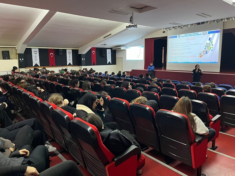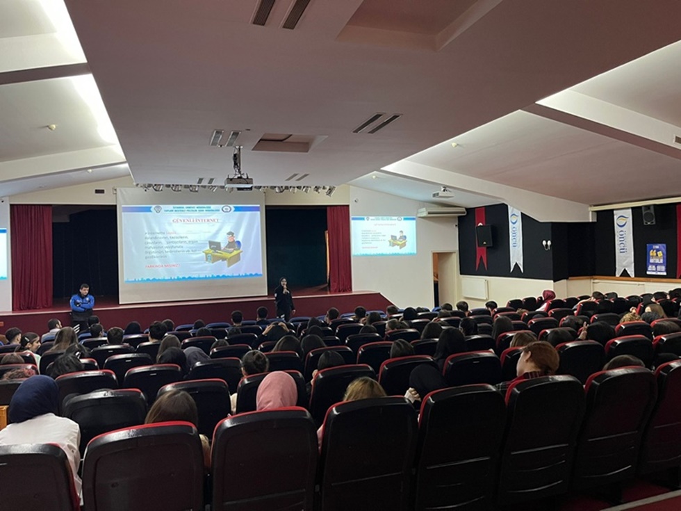 Konferans salonunda düzenlenen programda; internetin güvenli ve bilinçli kullanımı, siber suçlar, kişisel verilerin korunması ve dijital ortamlarda karşılaşılabilecek riskler hakkında öğrencilere bilgilendirme yapılmıştır. Sunumda, dijital ortamlarda güvenli davranış biçimlerinin önemi vurgulanmış, alınması gereken tedbirler örneklerle açıklanmıştır.