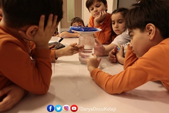 Çekmeköy Derya Öncü Kolejinde bu hafta bulutların nasıl oluştuğunu, yağmur ve kar yağışlarının nasıl gerçekleştiğini öğrendik. Önce kaynar suyu kavanozumuza doldurduk ve oluşan buharı ellerimizde hissettik. Kuru olduğundan emin olduğumuz tabağımızı kavanozun üzerine yerleştirdik, arkasından buzluktan çıkardığımız donmuş buz torbasını tabağımızın üzerine koyduk veee kavanozun içinde bulut oluşumununu gözlemledik. Tabağı kaldırdığımızda ise alt kısmında su damlalarını gözlemledik. Buharlaşan havanın soğuk bir ortama çarptığında yoğunlaştığına tanık olduk.