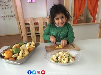 Sağlam kafa sağlam vücutta bulunur, sağlıklı beslenmek ve gelişimimiz için çok faydalı olan besinleri, besin pramidi oluşturarak görsel ve somutlaştırarak öğrendik. Mutfak etkinliğinde meyve salatası hazırlayıp afiyetle yedik.