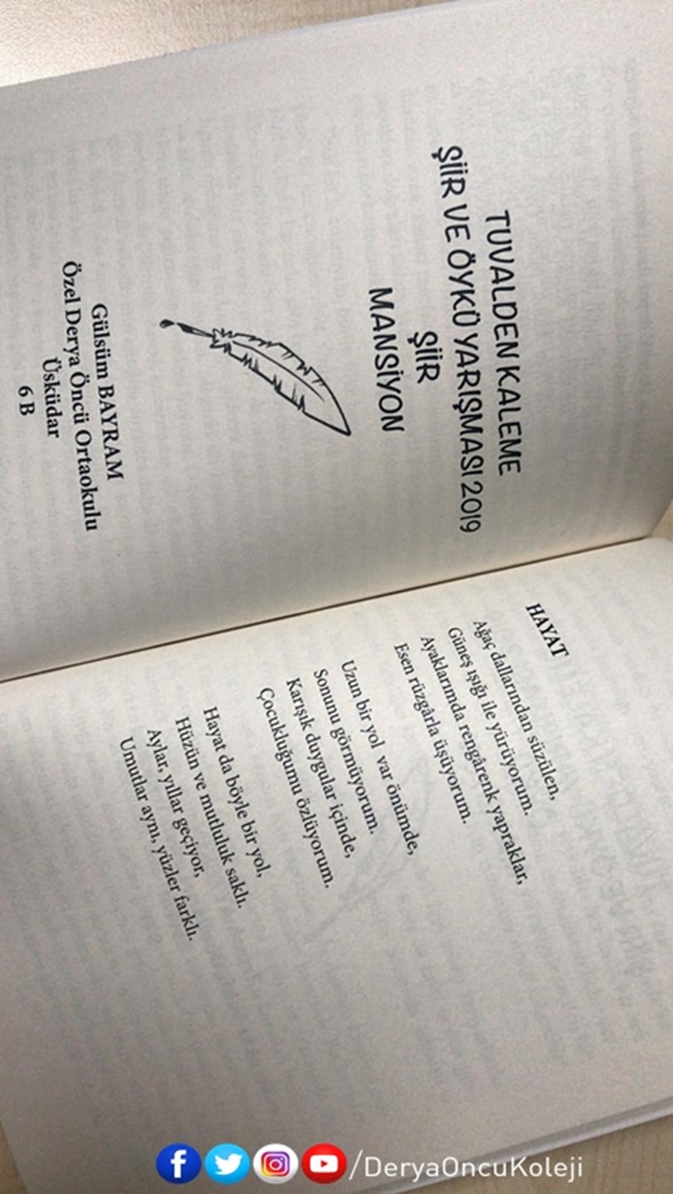 Yarışmaya katılan ve derece elde eden tüm öğrencilerin yazılarından oluşan bir kitapta da şiiriyle yer alan öğrencimizin yazma aşkının ve ilhamının daim olmasını ümidiyle...